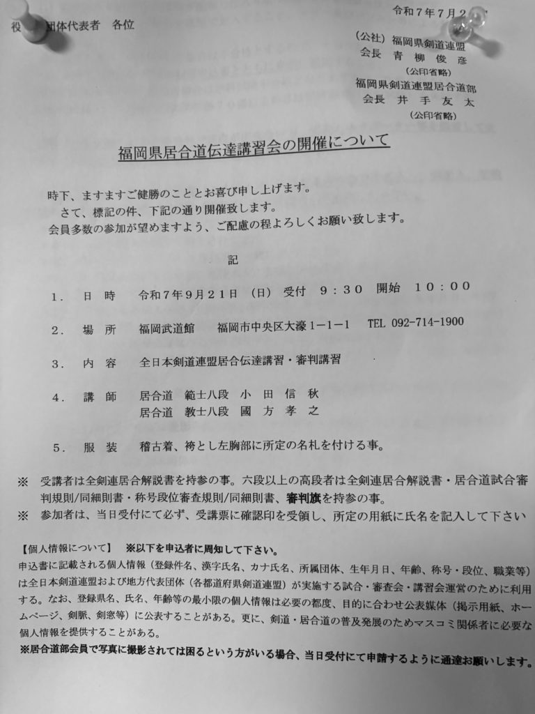 2025-08-06 伝達講習会 開催日: 2025年9月21日カテゴリー: 講習会 次の稽古日は1月25日㈰です。2月の稽古は水曜日、土曜日ともすべて可能です。 第122回 全日本剣道演武大会の申込書は2月4日㈬の稽古日までに当会の事務局まで提出してください。 新しく居合をはじめたい方の見学や体験のご希望はメールにてお問い合せください。 Home › 伝達講習会 関連記事 鈍舟の通武揶気:「能舞台の歩き方」 県大会の結果 2023京都大会 鈍舟の通武揶気:残心(8) ⑥冬眠10年啓蟄